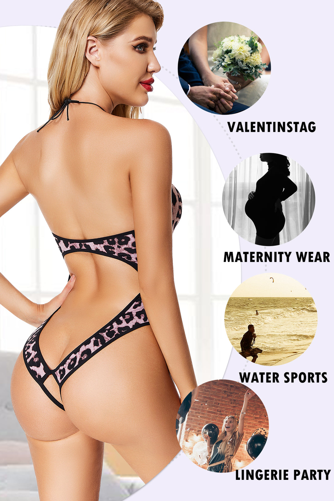 - ღ Lace halter teddy bodysuit lingerie for women features a deep plunging neckline, halter straps and open crotch design. You can go to the bathroom without taking off the whole teddy lingerie. Easy to put on and off.The cute lingerie will make you more flattering.