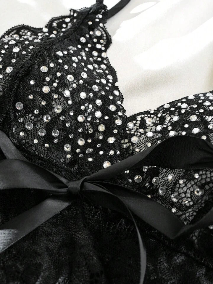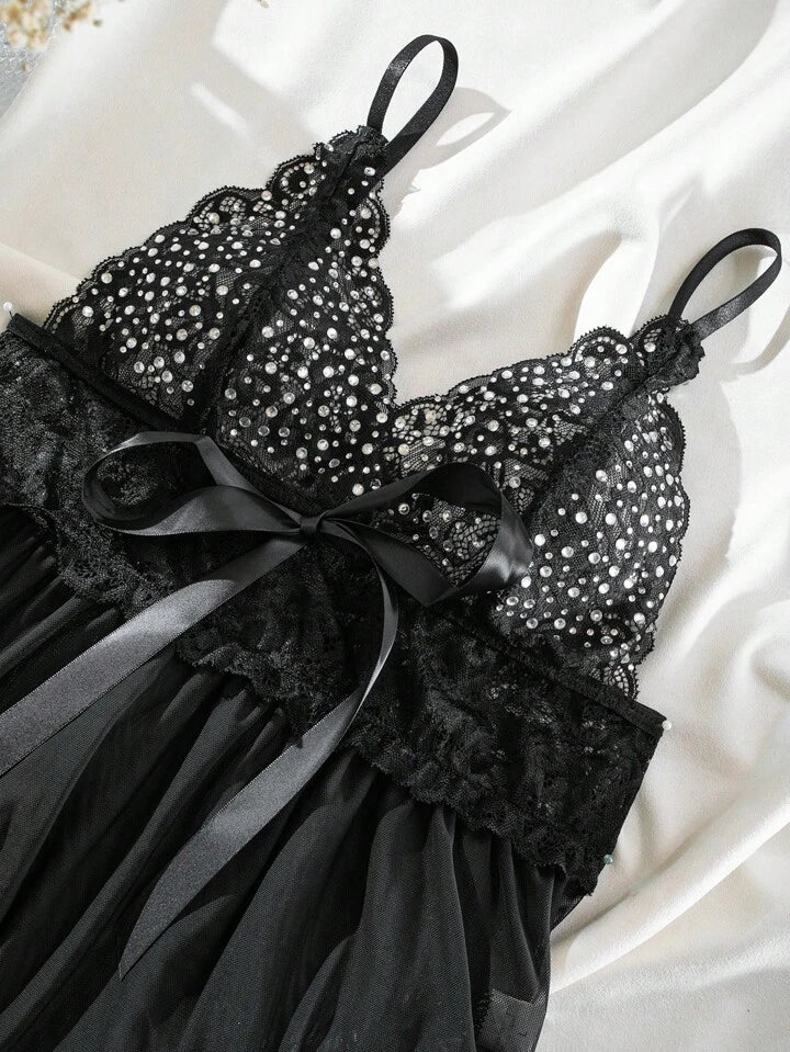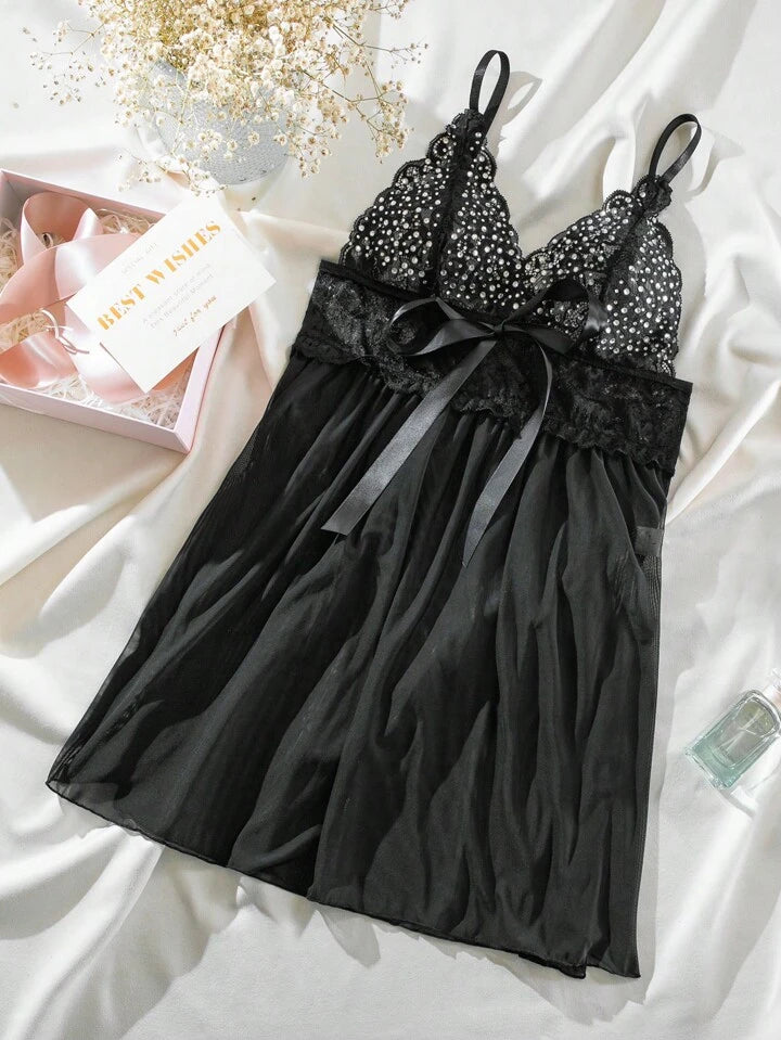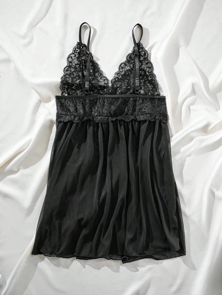 Adsexy Contrast Lace Tie Front Mesh Slips Babydoll Sleepwear