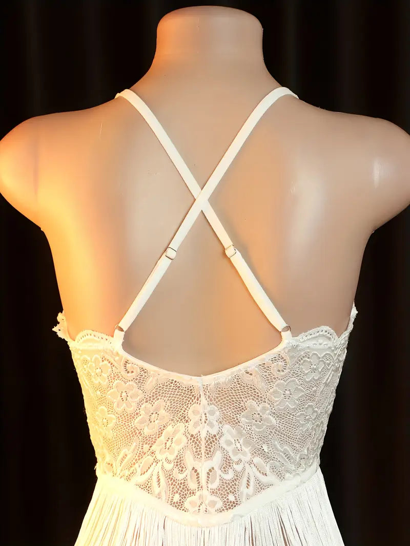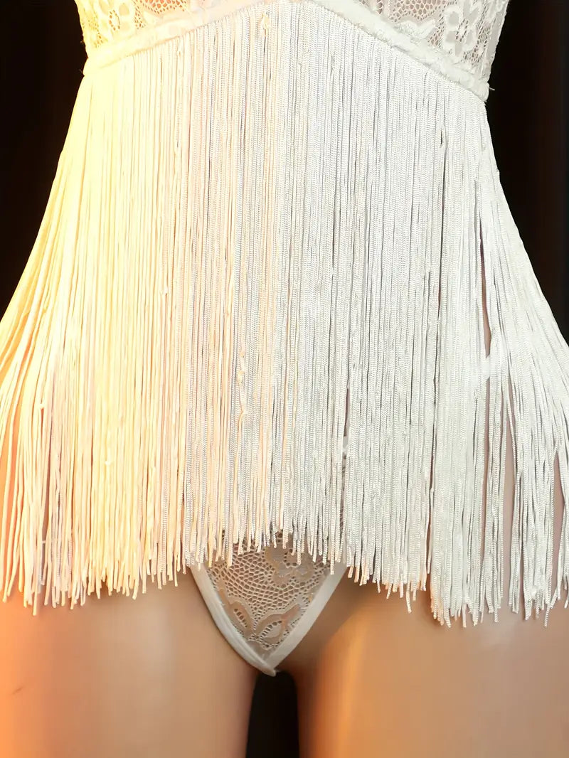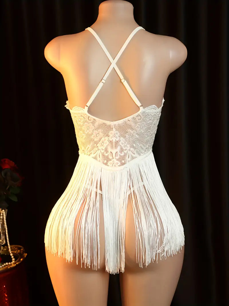 Sexy and hot lace sheer temptation with tassels camisole dress, big back exposure nightgown, passionate bed outfit, revealing sexy doll dress, bold lingerie, exotic and enticing mesh underwear in white.