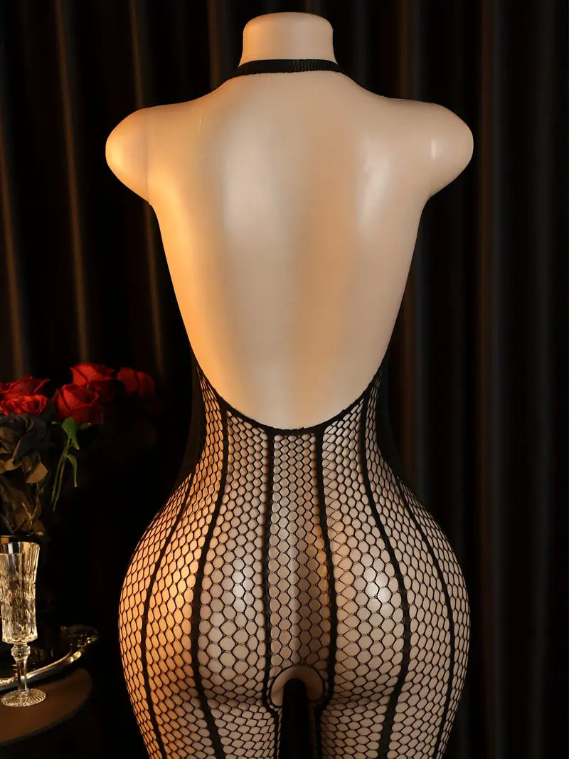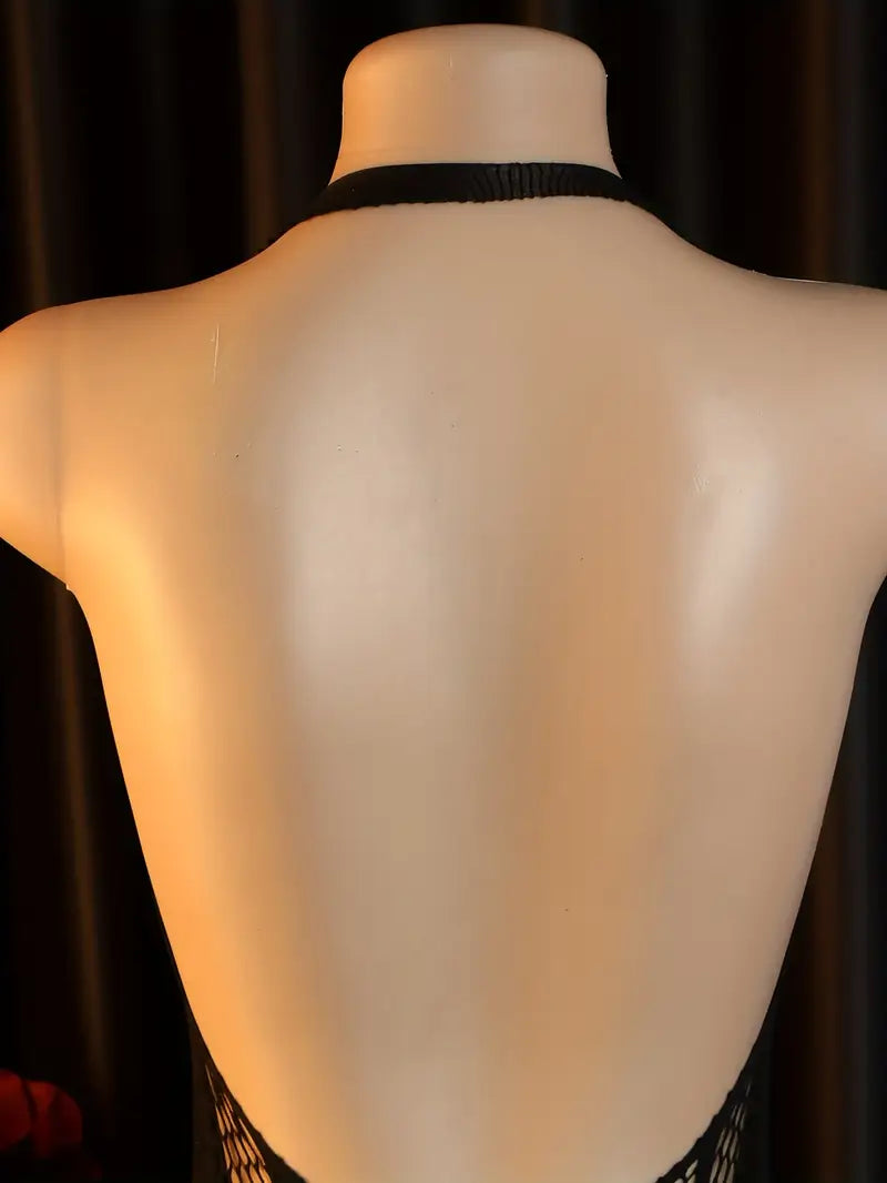 Plus size erotic lingerie, halterneck chest cut-out crotch one-piece mesh, sexy see-through fishnet bodysuit, openwork bandeau tights, bold revealing exotic seductive underwear black
