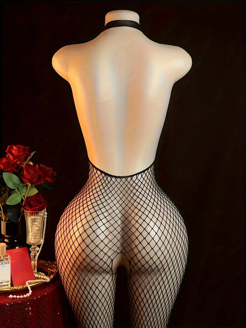 Plus size erotic underwear, strappy halterneck leaky chest open crotch one-piece mesh, sexy suspender fishnet one-piece suit, cut-out see-through sleeveless mesh tights, women's black sexy lingerie