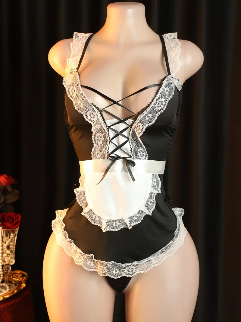 Sexy lace lingerie maid costume, see-through uniform with seductive cutouts, cute sleepwear role-play outfit, exciting set with open crotch, bold and revealing seductive lingerie.