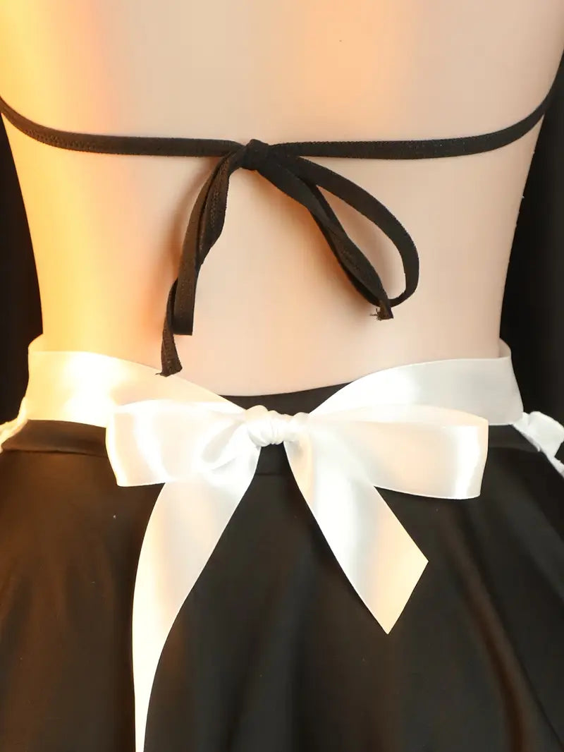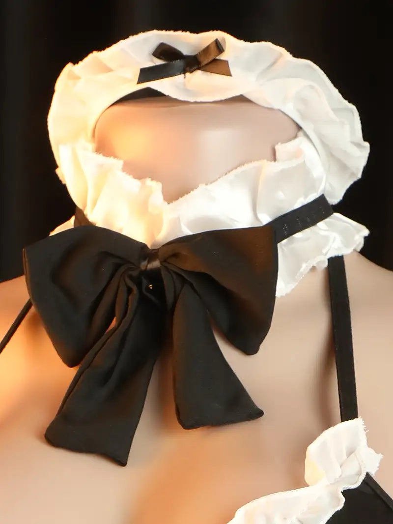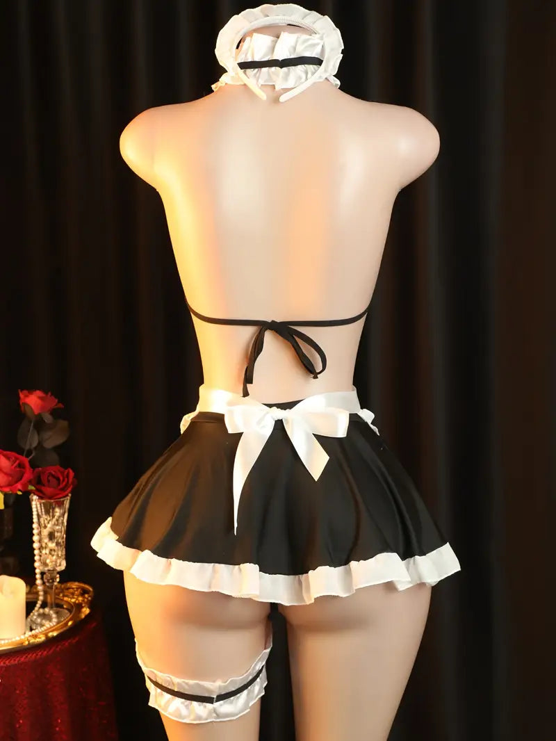 Sexy lingerie maid outfit with ties, sheer uniform for temptation, cute sleepwear role play passionate set, open-crotch, bold erotic clothing, revealing exotic tempting lingerie.