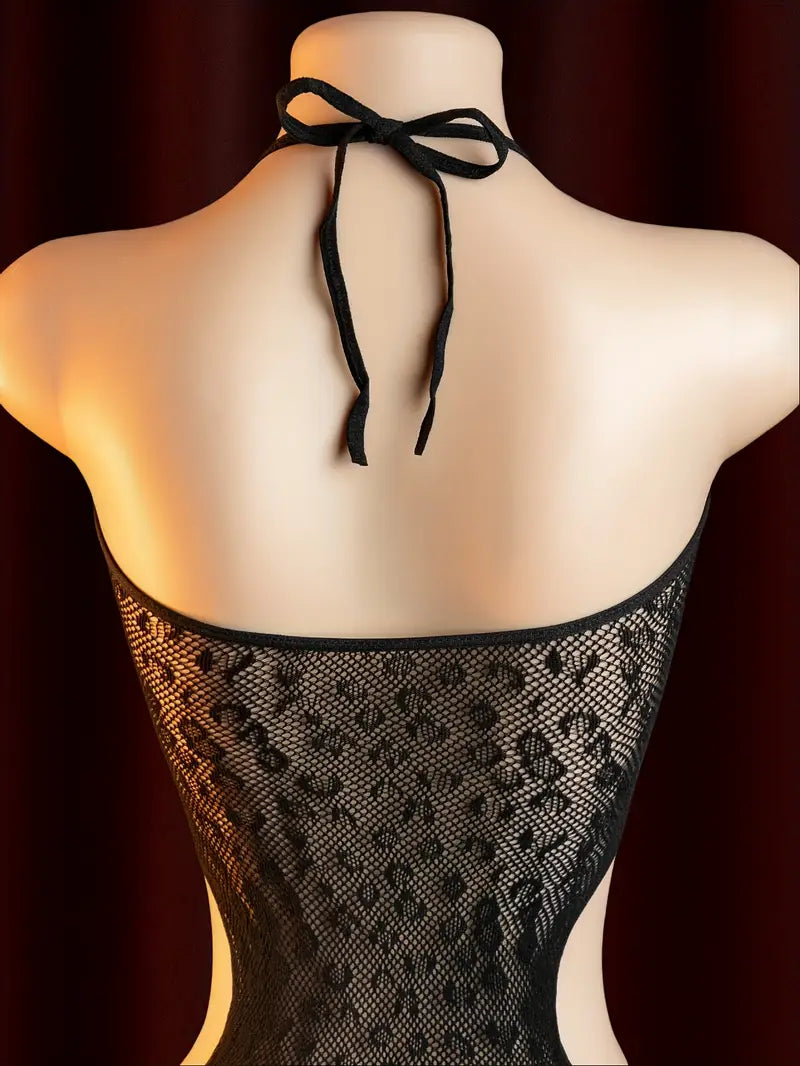 Sexy lingerie sheer leopard print dress halter neck fishnet back hollow out bodycon fishnet dress large mesh bodysuit big hole doll dress daring intimate wear revealing exotic alluring lingerie